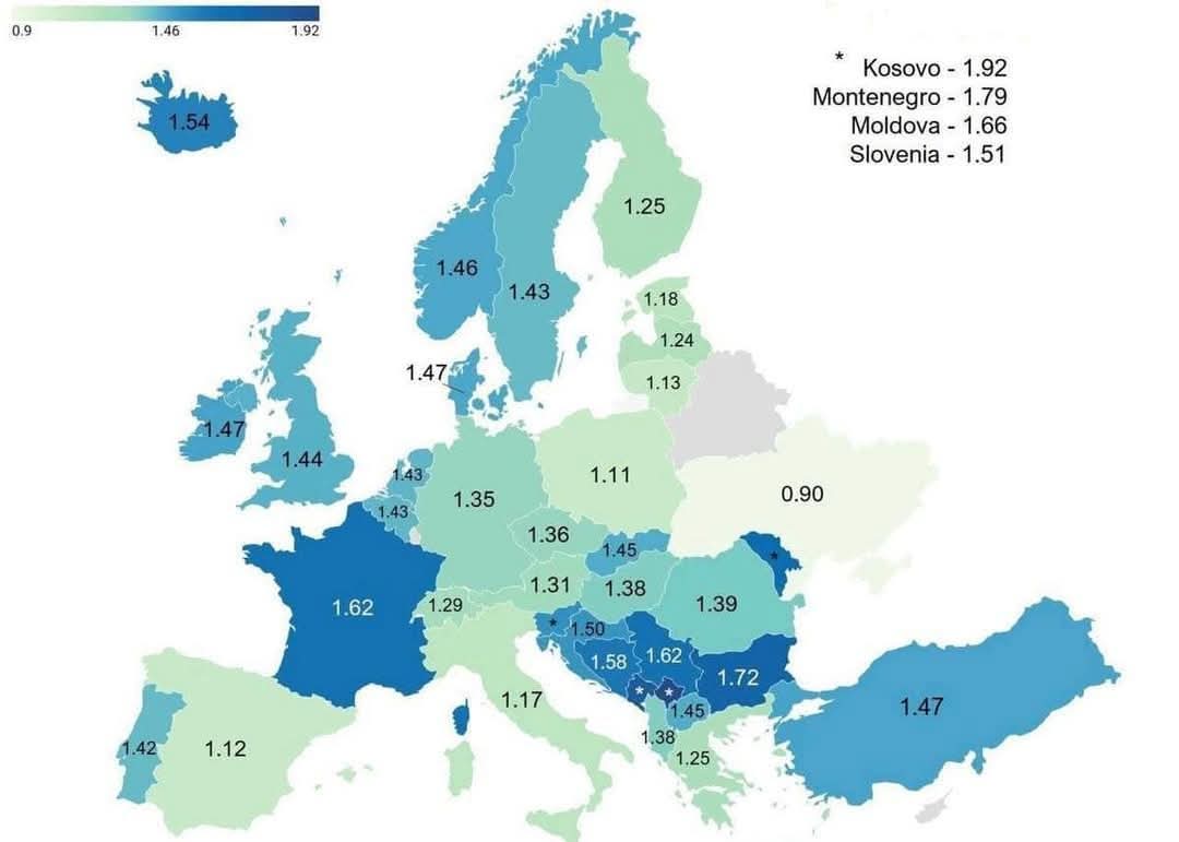 Avropa ölkələrində təxminən bu rəqəmlərdir: 1 ilə 1.8 arasında. Bu isə orda ciddi demoqrafik problemlərə gətirib çıxarır. Azərbaycan üçün 1,6 çox aşağı göstəricidir. Bizdə minimum 2.5 - 3 olmalıdır; əvvəllər belə idi.