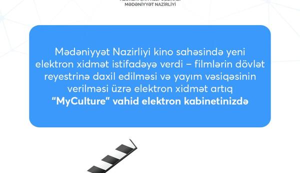 Mədəniyyət Nazirliyi kino sahəsində yeni elektron xidmət istifadəyə verib – filmlərin dövlət reyestrinə daxil edilməsi və yayım vəsiqəsinin verilməsi üzrə elektron xidmət artıq “MyCulture” vahid elektron kabinetinizdə əlçatandır.