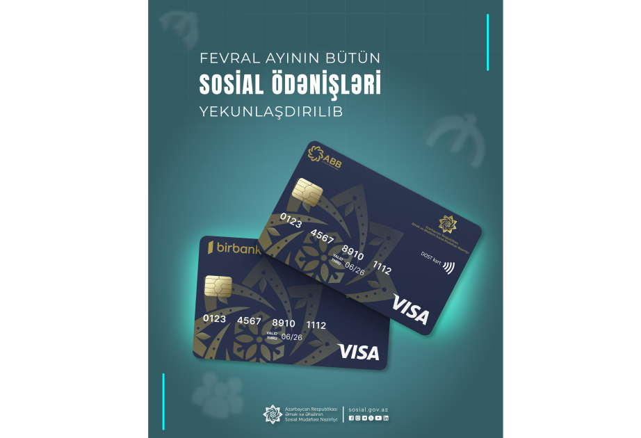 Əmək və Əhalinin Sosial Müdafiəsi Nazirliyinin tabeliyində Dövlət Sosial Müdafiə Fondu tərəfindən bu gün fevral ayının müavinət, təqaüd və ünvanlı dövlət sosial yardımları ödənilib.Nazirliyin İctimaiyyətlə əlaqələr şöbəsindən SİA-ya verilən məlumata görə, fond bu ayın bütün sosial ödənişlərini başa çatdırıb.Bundan əvvəl fevralın 13-də Bakı, Sumqayıt şəhərləri, Abşeron rayonu, Naxçıvan Muxtar Respublikası, fevralın 20-də digər bölgələrdə yaşayan pensiyaçıların və güzəştli şərtlərlə pensiya təyin edilmiş şəxslərin fevral ayı üzrə pensiyaları ödənilib.