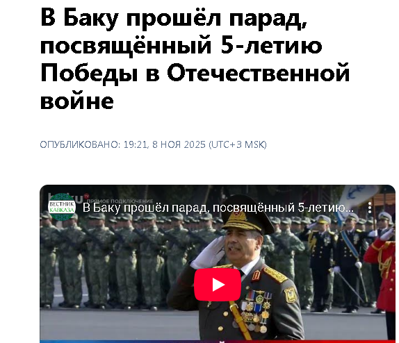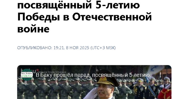 Vestikavkaza.ru yazır ki, 44 günlük Vətən Müharibəsində Qələbənin 5-ci ildönümünə həsr olunmuş hərbi paradda Azərbaycan Prezidenti İlham Əliyev həmin müharibənin tarixindən və müharibədən sonrakı işğaldan azad edilmiş ərazilərin dirçəlişindən danışıb. O, xatırladıb ki, 1990-cı illərin əvvəllərində Ermənistan Azərbaycan ərazisinin 20%-ni işğal edib; təxminən bir milyon azərbaycanlı qaçqın və məcburi köçkün vəziyyətinə düşüb. Onlara qarşı müharibə cinayətləri, Xocalı soyqırımı və etnik təmizləmə siyasəti törədilib. Sülh danışıqları apararkən eyni zamanda bəyan etdik ki, əgər onlar uğursuz olarsa, Azərbaycan tarixi, əzəli torpaqlarını hərbi yol da daxil olmaqla, istənilən vasitə ilə azad edəcək. Bu uzun sürən danışıqların nəticəsi sıfır oldu, çünki Ermənistanın Azərbaycan torpaqlarını könüllü olaraq azad etmək niyyəti yox idi. Lakin Bakı ölkənin ərazi bütövlüyünün və suverenliyinin tam bərpasında israr etdi".
