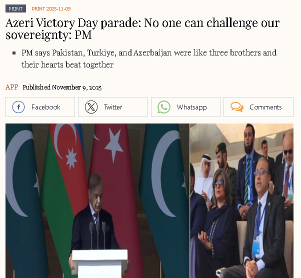 Pakistanın biznes və iqtisadi xəbər portalı olan "Business Recorder" yazır ki, ölkənin baş naziri Məhəmməd Şehbaz Şərifin Azərbaycana olan son səfəri bir daha təkrarladı ki, Pakistan da, Azərbaycan və Türkiyə qardaşları kimi sülh axtarır. Pakistanlı nazirin parad çərçivəsindəki çıxışından sitatlar verən məqalədə bildirilir: "Şübhə olmasın - heç kimə suverenliyimizə meydan oxumağa və ya ərazi bütövlüyümüzü pozmağa icazə verilə bilməz. Pakistan, Türkiyə və Azərbaycan üç qardaş kimidir və ürəkləri bir-biri ilə döyünür. Biz indi çiyin-çiyinə dayanaraq bu əlamətdar hadisəni qeyd edirik".