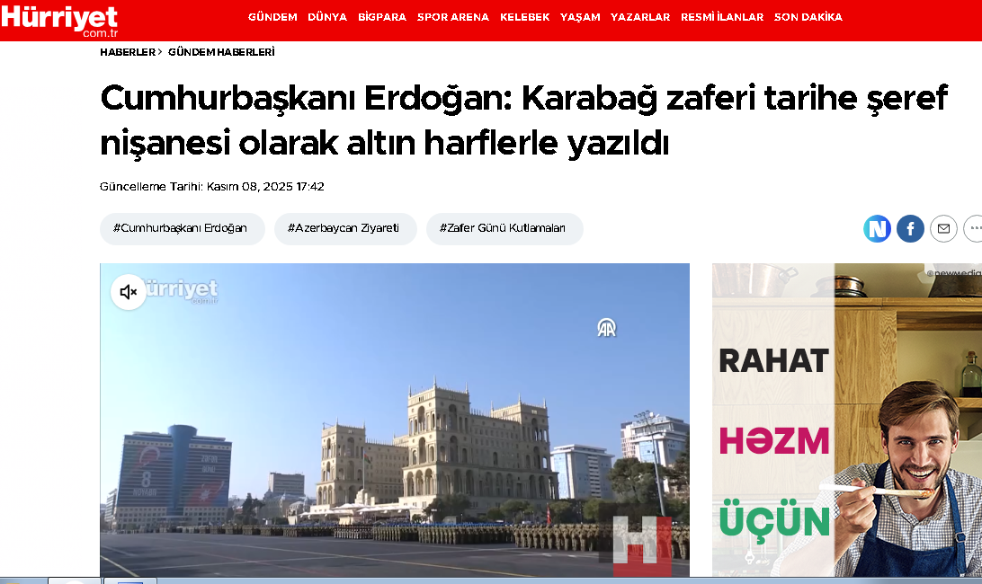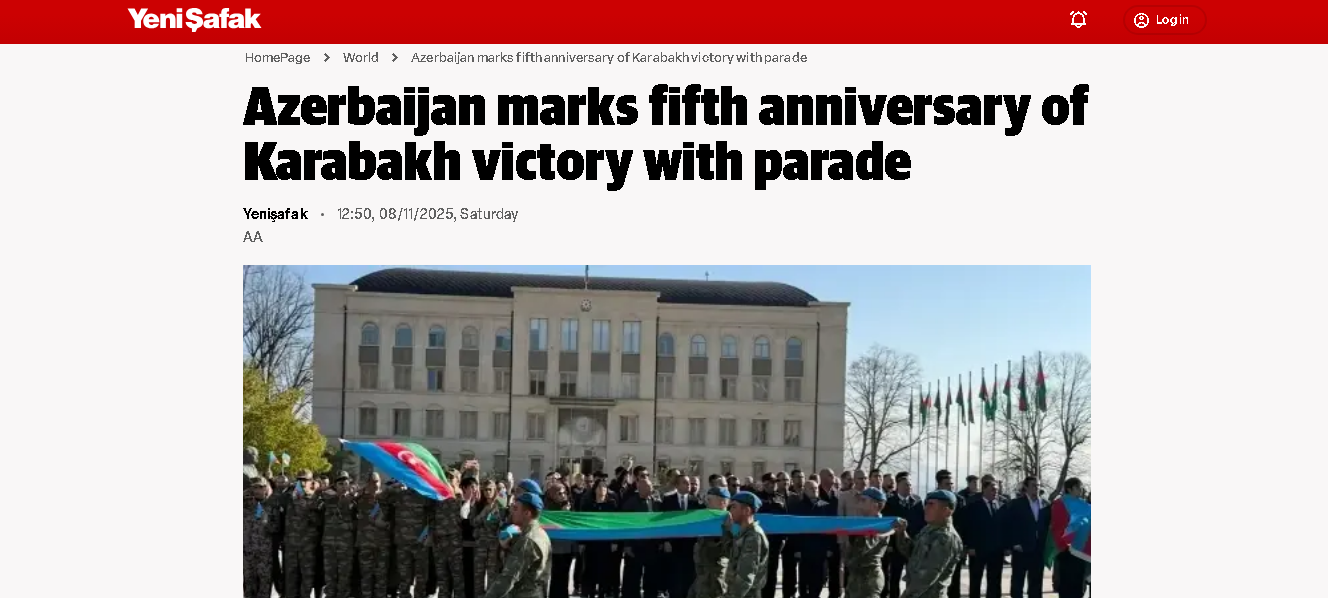 Türkiyənin Yeni Şafak portalında yayımlanmış "Azərbaycan Qarabağ qələbəsinin beşinci ildönümünü paradla qeyd edir" başlıqlı məqalədə də 8 noyabrda Bakıda təşkil olunmuş hərbi parad barədə yazılıb. Məqalədə yazılır: "Azərbaycan Prezidenti İlham Əliyev İkinci Qarabağ müharibəsində Azərbaycanın qələbəsinin beşinci ildönümünü qeyd etmək üçün Bakıda hərbi parada sədrlik etdi. Xatirə tədbirləri zamanı Əliyev vurğuladı ki, onilliklər boyu davam edən strateji hazırlıq, iqtisadi inkişaf və hərbi potensialın artırılması nəticədə Azərbaycana təxminən otuz ildir Ermənistanın işğalı altında olan əraziləri geri qaytarmağa imkan verdi. Azad edilmiş ərazilərdə aparılan yenidənqurma işləri vurğulandı".