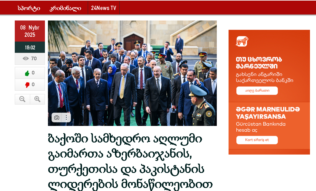 Gürcüstanın 24News.ge xəbər saytı da parad barədə məqalə yayımlayıb. 4 dildə Gürcüstanda fəaliyyət göstərən sayt paradın gedişini əks etdirən bir neçə məqalə dərc edib: “Azərbaycan, Türkiyə və Pakistan liderlərinin iştirakı ilə Bakıda hərbi parad keçirilib" başlıqlı məqalədə bildirilir ki, Bakının Azadlıq meydanında noyabrın 8-də Vətən müharibəsində Qələbənin beşinci ildönümünə həsr olunmuş hərbi paradda Müdafiə naziri general-polkovnik Zakir Həsənov Azərbaycan Prezidenti, Silahlı Qüvvələrin Müzəffər Ali Baş Komandanı İlham Əliyevə raport verib. Daha sonra Azərbaycan, Türkiyə və Pakistan liderləri çıxışlar ediblər. Hərbi texnikaların keçidi ilə davam edən paradda Hərbi Dəniz Qüvvələrinin və Dövlət Sərhəd Xidməti Sahil Mühafizəsinin döyüş gəmiləri və katerləri Xəzər dənizinin sahil sularında yüksək döyüş hazırlığı nümayiş etdirib. Bundan sonra Azadlıq meydanı üzərində Azərbaycan və Türkiyə pilotlarının iştirakı ilə Hərbi Hava Qüvvələrinə məxsus döyüş təyyarələrinin və helikopterlərin uçuşu olub."