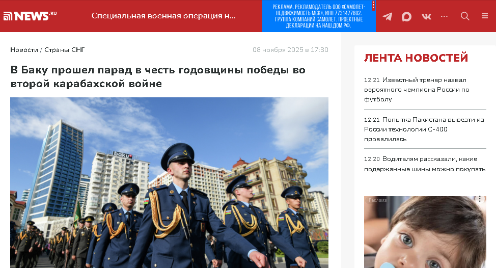 News.ru: "II Qarabağ müharibəsindəki qələbənin ildönümü münasibətilə Bakıda parad keçirilib"