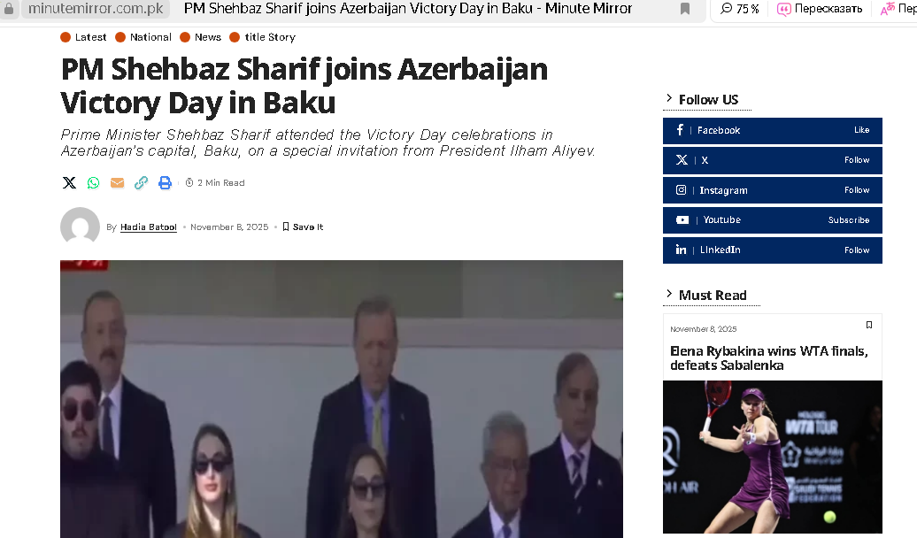 Pakistanın ingilisdilli gündəlik qəzeti "Minute Mirror" da Bakıdakı parad barədə məqalə dərc edib. Məqalədə deyilir: "Baş nazir Şehbaz Şərif Prezident İlham Əliyevin xüsusi dəvəti ilə Azərbaycanın paytaxtı Bakıda keçirilən Qələbə Günü şənliklərində iştirak edib. Mərasimdə Türkiyə Prezidenti Rəcəb Tayyib Ərdoğan və dost ölkələrin hərbi kontingentləri də iştirak edib. Tədbir Azərbaycan, Pakistan və Türkiyə arasında artan əlaqələri vurğulayan əhəmiyyətli bir diplomatik hadisə ilə yadda qalıb. Şənliklər zamanı hər üç ölkənin dövlət himnləri səsləndirilib. Pakistan Ordusunun xüsusi kontingenti də Pakistanın Azərbaycanla həmrəyliyini simvolizə edən Qələbə Günü paradında iştirak edib".