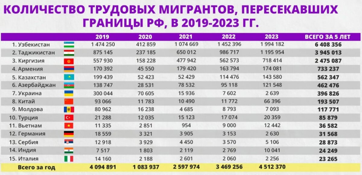 Dövlət Dumasındakı "Ədalətli Rusiya" fraksiyasının lideri Sergey Mironov bu ilin əvvəlində daha təsirli rəqəmləri açıqladı. Onun ictimai çıxışı göstərdi ki, 2024-cü ilin sonuna qədər təkcə Qırğızıstan və Özbəkistan vətəndaşları Rusiyadan öz ölkələrinə 14 milyard dollardan çox pul köçürüblər. Siyasətçi həmçinin miqrantların böyük əksəriyyətinin Rusiyada heç bir vergi ödəməməsindən təəssüfləndiyini bildirib. Bu son məqam, şübhəsiz ki, diqqətçəkəndir, lakin işəgötürənlər nəticədə miqrantlar üçün Rusiya xəzinəsinə ödəyirlər və miqrant fobiyasına əsaslanan mübahisələr aparmaq əvəzinə, onlara müraciət etmək daha yaxşı olardı.