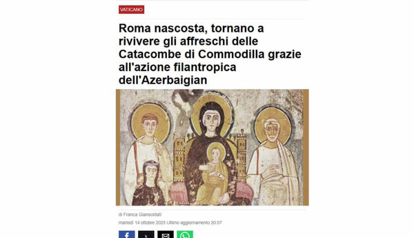 Qarşılıqlı etimad, yüksək səviyyəli əməkdaşlıq əsasında qurulan beynəlxalq əlaqələr müasir dövrümüzdə daha da möhkəmlənir. Əlbəttə ki, Azərbaycanla İtaliya arasında əlaqələrin inkişafına böyük təkan verən məqamların mövcudluğunu şərtləndirən xeyli sayda nümunələr var. Bu əlaqələrin qurulmasında Heydər Əliyev Fondunun da müstəsna rolu var. Azərbaycan Respublikasının Birinci vitse-prezidenti, Heydər Əliyev Fondunun prezidenti Mehriban xanım Əliyeva tərəfindən İtaliyada həyata keçirilən layihələr bu ölkənin mədəni irsinin qorunması baxımından önəmlidir. Azərbaycanın Birinci vitse-prezidenti Mehriban Əliyevanın çoxşaxəli fəaliyyəti nəticəsində İtaliyada mədəni və humanitar sahələrdə, o cümlədən, mədəni abidələrin bərpası ilə bağlı bir sıra layihələr həyata keçirilib. Bəşəriyyət üçün önəmli dəyər olan Roma katakombaları Fondun dəstəyi ilə yenidən həyat qazanıb. Müqəddəs Marçellinio və Pietro katakombalarının bərpası Müqəddəs Taxt-Tacın və Azərbaycanın müştərək layihəsinin tərkib hissəsidir.