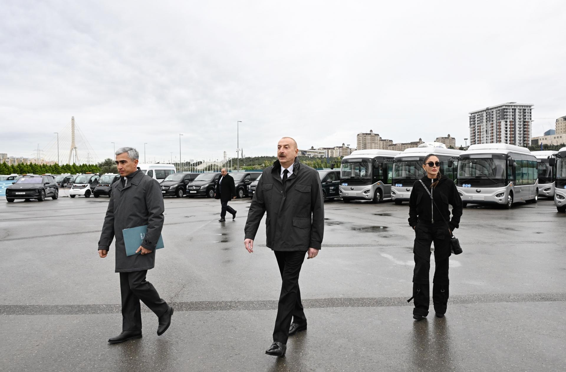 Prezident İlham Əliyev və birinci xanım Mehriban Əliyeva COP29-un keçiriləcəyi tarixlərdə tədbir məkanı ərazisində istifadə ediləcək yük və sərnişindaşıma, eləcə də tibbi və yanğınsöndürmə üçün nəzərdə tutulan elektrikli minimobillər, Sammit zamanı yüksəksəviyyəli qonaqların ərazidə hərəkətini təmin etmək üçün istifadə olunacaq qolf-mobillər və elektrikli avtobuslar, həmçinin tədbir günlərində şəhər ərazisində hərəkət edəcək digər elektrikli nəqliyyat vasitələrinə baxıblar.
