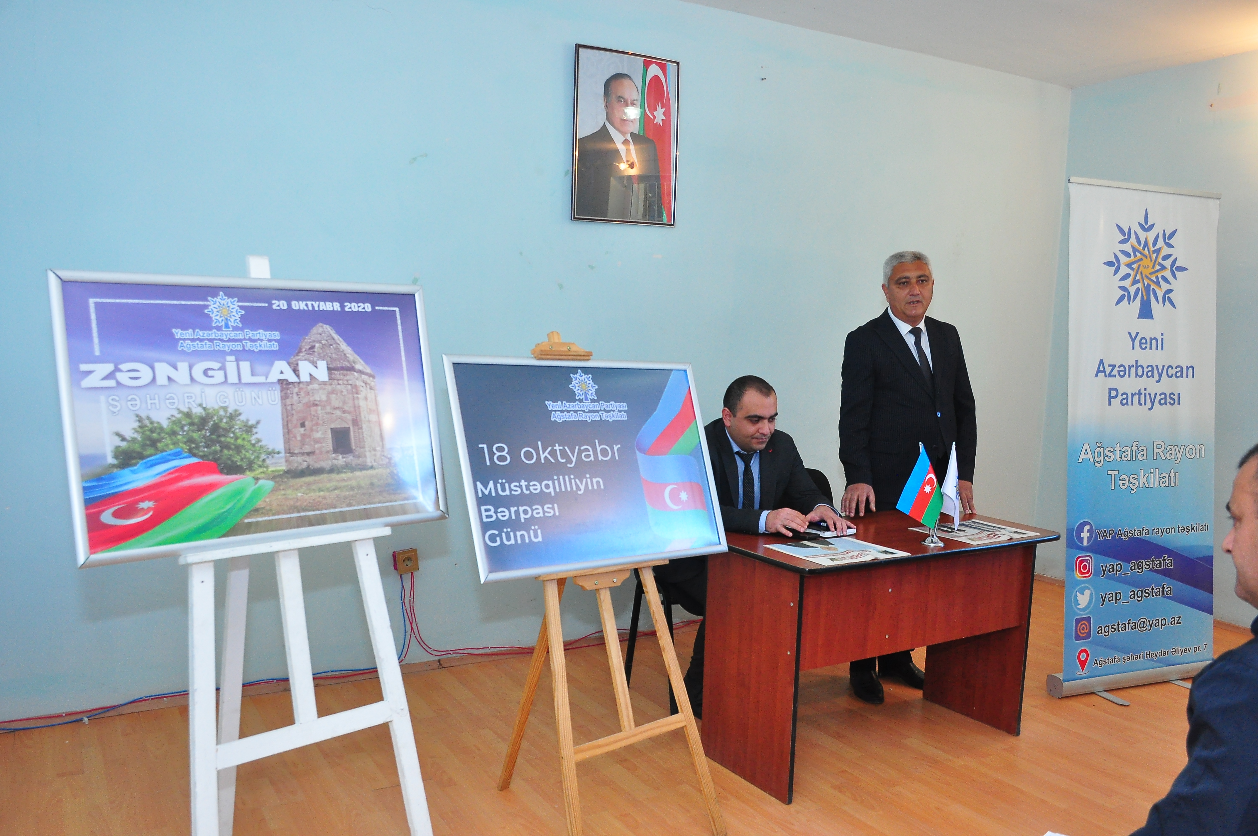Tədbiri giriş sözü ilə YAP Ağstafa rayon təşkilatının əməkdaşı Yunis Eyyubov qeyd edib ki, tarixi Qələbə günlərinin əbədiləşdirilməsi dövlət siyasətinin tərkib hissəsidir. Prezident İlham Əliyevin 31 iyul 2023-cü il tarixli Sərəncamı ilə Azərbaycan Respublikasının işğaldan azad edilmiş əraziləri üzrə şəhər günləri təsis edilmişdir. Sözügedən Sərəncama əsasən 20 Oktyabr – Zəngilan Şəhəri Günü kimi müəyyən olunub. Şanlı Zəfər yürüşünün – Vətən müharibəsinin 24-cü günü - 20 oktyabr tarixi həm xalqımızın, həm də zəngilanlıların yaddaşına əbədi həkk olunub. Çünki həmin gün Zəngilan Ermənistan silahlı qüvvələrinin işğalından azad edilib. 27 il davam etmiş işğala son qoyulan bu tarixi günü zəngilanlılar böyük fəxr və qürur hissi ilə xatırlayırlar. Həmçinin qeyd olunub ki, dövlət müstəqilliyinin əldə edilməsi xalqımızın ən böyük nailiyyətlərindən biridir. Əldə edilmiş müstəqilliyin, sabitliyin qorunub saxlanılması, Azərbaycanın müstəqil dövlət olaraq dünya dövlətləri arasında rolunun və nüfuzunun möhkəmləndirilməsi məhz Ümummilli lider Heydər Əliyevin adı ilə bağlıdır. Ulu Öndər Heydər Əliyevin müəyyən etdiyi müdrik daxili və xarici siyasət Azərbaycan Respublikası Prezidenti, partiyanın Sədri İlham Əliyev tərəfindən uğurla davam etdirilir. Dövlət başçısının yürütdüyü müdrik və uzaqgörən siyasət nəticəsində 2020-ci il dövlətçilik tariximizə qızıl hərflərlə yazıldı. Azərbaycan Respublikasının Prezidenti, Müzəffər Ali Baş Komandan İlham Əliyevin rəhbərliyi ilə rəşadətli ordumuz işğalçı Ermənistan üzərində möhtəşəm Qələbə qazanaraq xalqımızın 30 illik həsrətinə son qoydu. Ali Baş Komandanımızın düşünülmüş strategiyası, siyasi iradəsi və qətiyyəti sayəsində qazanılan tarixi Zəfər, şanlı Qələbə illər ötsə də, heç vaxt unudulmayacaq.