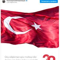 Azərbaycanın Birinci vitse-prezidenti Mehriban Əliyeva Türkiyənin Respublika Günü münasibətilə sosial şəbəkə hesablarında paylaşım edib. SİA-nın məlumatına görə, paylaşımda deyilir:"Qoy xalqlarımız qürur mənbəyi olan Azərbaycan-Türkiyə birliyi və qardaşlığı əbədi və sarsılmaz olsun!".