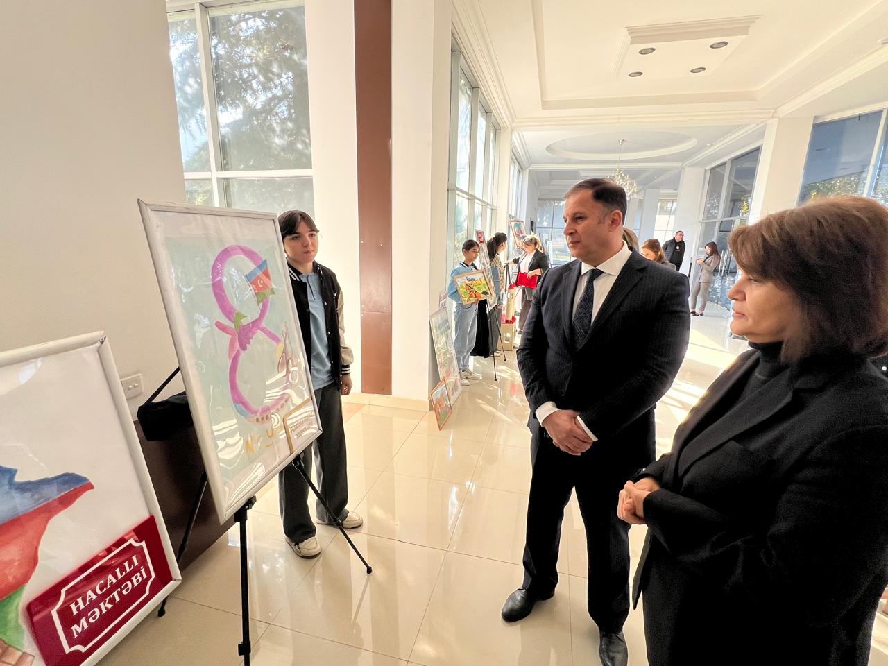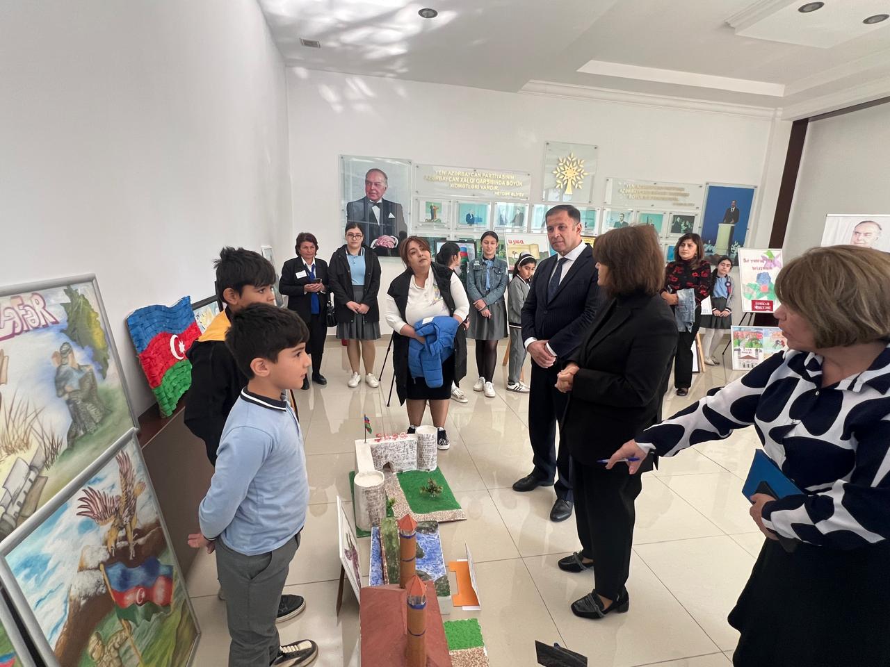 Sonra tədbir iştirakçıları sərgiyə baxış keçiriblər. Tamaşaçılara vətənpərvərlik mövzusunda müxtəlif janrlarda çəkilmiş rəsm əsərləri və əl işləri təqdim edilib.