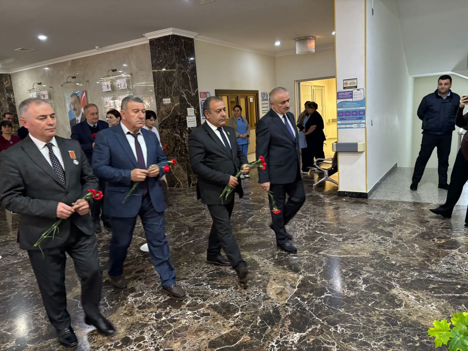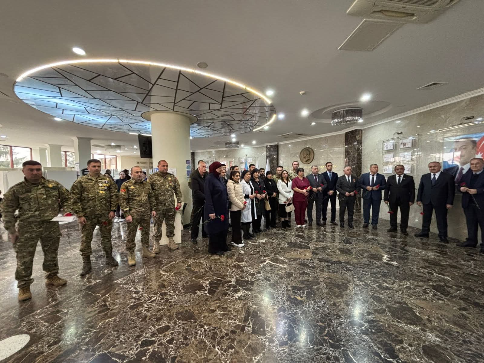 Tədbir öncəsi partiya fəalları, şəhid anaları,qazilər xəstəxananın foyesindəki şəhidlərin xatirə lövhəsinə güllər düzüblər. Zəfərimizin 5-ci ildönümünə həsr olunmuş "Qəhrəmanların izi ilə" mövzusunda tədbir Ulu Öndər Heydər Əliyevin və respublikamızın suverenliyi uğrunda canlarını fəda etmiş şəhidlərin xatirəsinin bir dəqiqəlik sükutla anılması ilə başlayıb,ardından Azərbaycan Respubkikasının Dövlət Himni səsləndirilib.