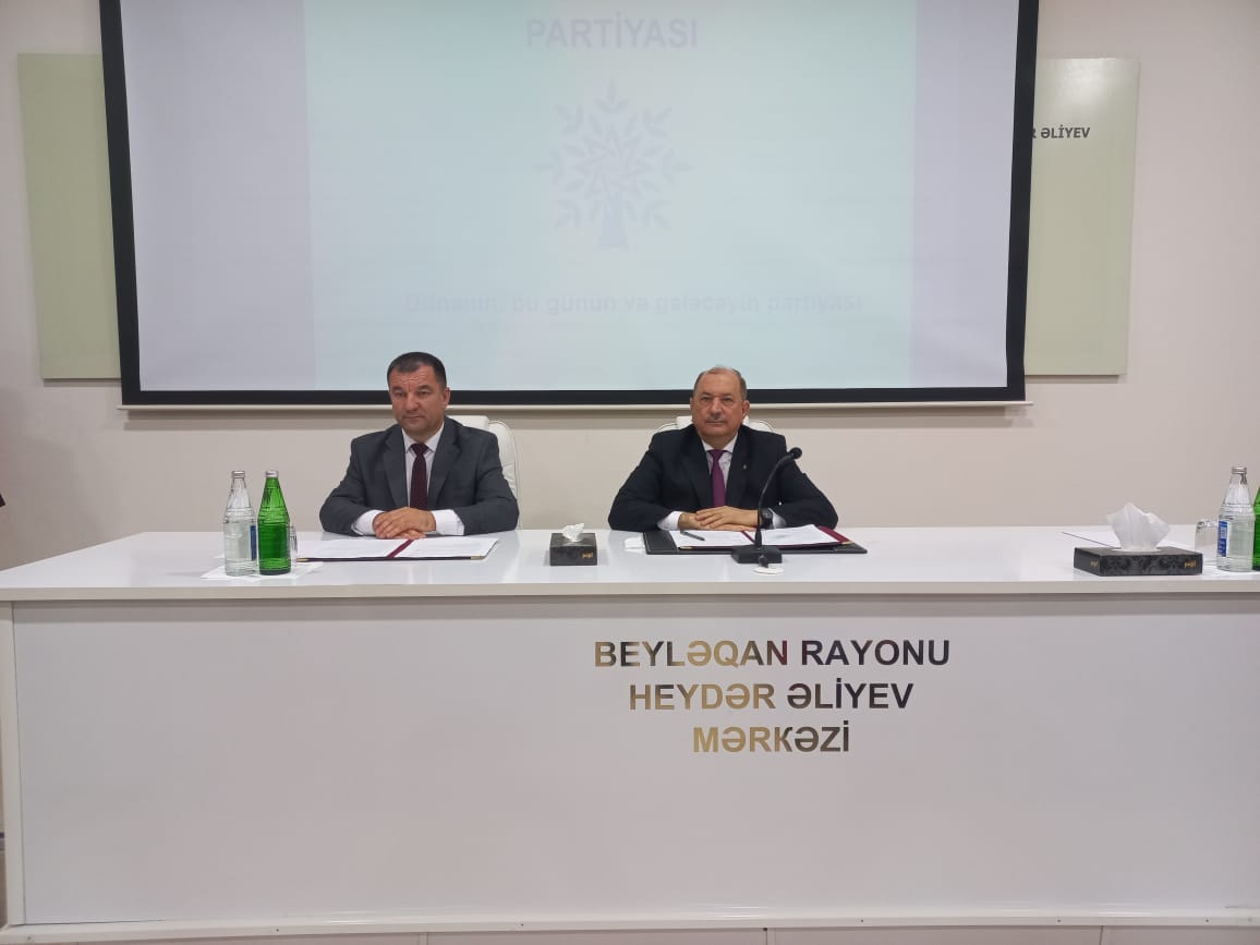 Tədbirdə çıxış edən Beyləqan rayon İcra Hakimiyyətinin başçısı Əziz Əzizov bildirdi ki, 21 noyabr 1992-ci ildə Naxçıvan şəhərində 550 nəfər nümayəndənin iştirakı ilə Yeni Azərbaycan Partiyası təsis olundu və Ulu Öndər Heydər Əliyev Yeni Azərbaycan Partiyasının sədri seçildi. Ümummilli Lider Heydər Əliyevin rəhbərlik etdiyi Yeni Azərbaycan Partiyası qısa müddət ərzində təşkilatlandı, xalqın dəstəyi ilə 1993-cü ildə hakimiyyətə gəldi. Bu xalqın dahi rəhbərə böyük inamının, onun rəhbərlik etdiyi partiyaya dəstəyinin bariz ifadəsi idi. Yeni Azərbaycan Partiyası yaranmasaydı və Ulu Öndər Heydər Əliyev hakimiyyətə gəlməsəydi ölkəmiz tamamilə fərqli tale yaşayacaqdı. Ümummilli Lider Heydər Əliyevin hakimiyyətə gəlməsi Azərbaycanın bəlalardan xilas olmasına gətirib çıxardı. Xaos, anarxiya, iqtisadiyyatda tənəzzül aradan qaldırıldı. İslahatlar həyata keçirildi, separatizimin qarşısı alındı. Azərbaycanın bu gün ki, inkişafa gəlib çatması üçün əlverişli mühit yarandı. Beləliklə Partiyanın VII Qurultayında qeyd edildiyi kimi Yeni Azərbaycan Partiyası əsl ümumxalq partiyasına çevrildi.