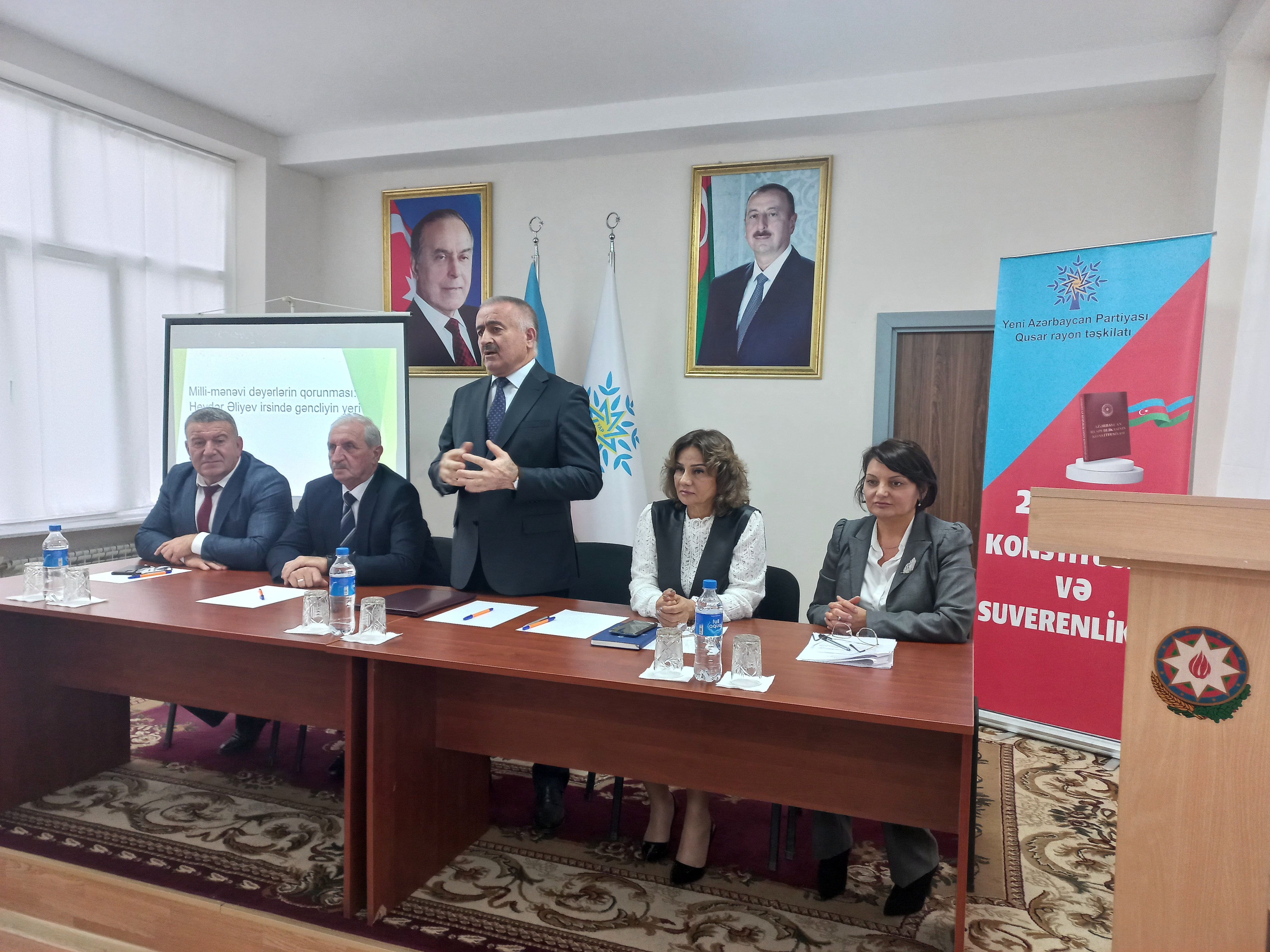 Yeni Azərbaycan Partiyası Qusar rayon təşkilatı “Konstitusuya və Suverenlik ili”çərçivəsində təşkilat nəzdində fəaliyyət göstərən “Heydər Əliyev siyasi məktəbini öyrənirik” dərslərinin “Milli mənəvi dəyərlərin qorunması: Heydər Əliyev irsində gəncliyin yeri” mövzusunda növbəti məşğələsi Qusar Peşə liseyində keçirilib.