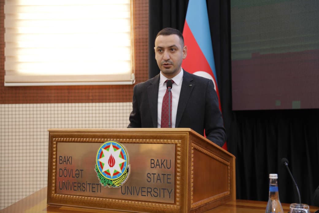 Tədbiri giriş sözü ilə açan Yeni Azərbaycan Partiyası Gənclər Birliyi üzvü, Geologiya fakültəsinin tədris işləri üzrə dekan müavini İlqar Quliyev çıxışında ali təhsilin dövlətçilik ideyalarının təbliğində mühüm rolundan bəhs edib. O, qeyd edib ki, Konstitusiya və Suverenlik İli çərçivəsində keçirilən bu cür tədbirlər tələbələrin yalnız peşəkar mütəxəssis kimi deyil, eyni zamanda vətənpərvər, hüquqi və siyasi baxımdan məlumatlı vətəndaş kimi formalaşmasına xidmət edir. İlqar Quliyev Prezident İlham Əliyevin rəhbərliyi ilə həyata keçirilən təhsil islahatlarının ölkənin uzunmüddətli inkişaf strategiyasının əsas tərkib hissəsi olduğunu vurğulayıb. O, Geologiya fakültəsində tədrisin müasir tələblərə uyğun qurulduğunu, elmi biliklərlə yanaşı, milli-mənəvi dəyərlərin də tələbələrə aşılandığını bildirib. Dekan müavini belə tədbirlərin universitet mühitində ictimai-siyasi maarifləndirməni gücləndirdiyini və gənclərin ölkədə baş verən yeni reallıqları daha dərindən dərk etməsinə imkan yaratdığını qeyd edib.