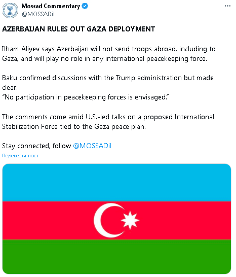 İsrailin milli kəşfiyyat xidməti Mossad sosial şəbəkə hesabında Azərbaycan prezidenti İlham Əliyevin bəyanatını yayıb. Bəyanatda vurğulanıb ki, Azərbaycan silahlı qüvvələrini Qəzza zolağı da daxil olmaqla, ölkə xaricinə göndərmək niyyətində deyil və heç bir beynəlxalq sülhməramlı qüvvələrdə iştirak etməyi planlaşdırmır.
