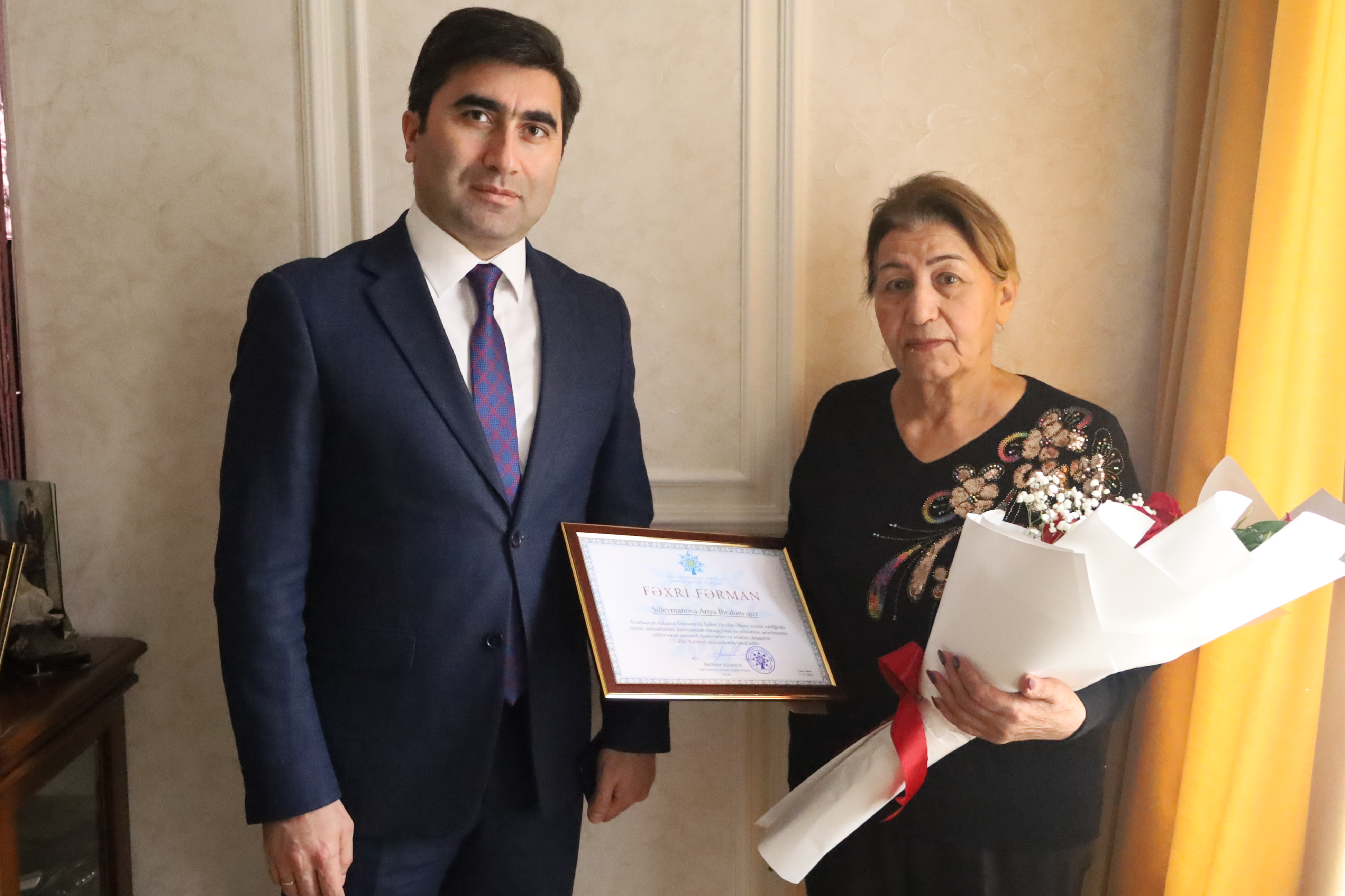 Sonda partiya veteranı Anya Süleymanovaya Azərbaycan xalqının Ümummilli Lideri Heydər Əliyev irsinin təbliğində xüsusi xidmətlərinə, təşkilatın ictimai-siyasi həyatında fəal iştirakı, 75 illik yubileyi münasibətilə Fəxri Fərman və xatirə hədiyyəsi təqdim edilib.