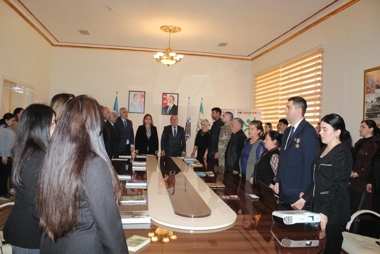 TədbirzamanıAzərbaycan Respublikasının qurucusu və yaradıcısı Ulu Öndər Heydər Əliyevin və torpaqlarımızın azadlığı uğrunda canlarından keçmiş şəhidlərimizin əziz xatirəsi bir dəqiqəlik sükutla yad edilib.