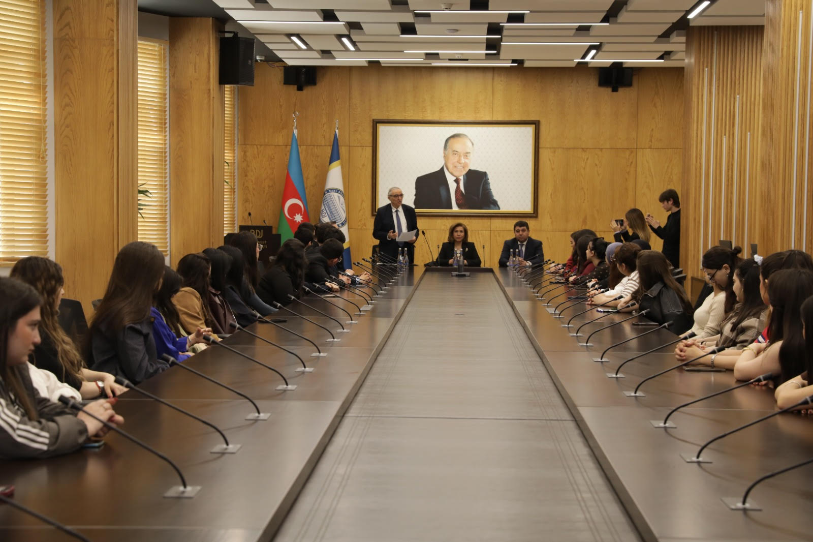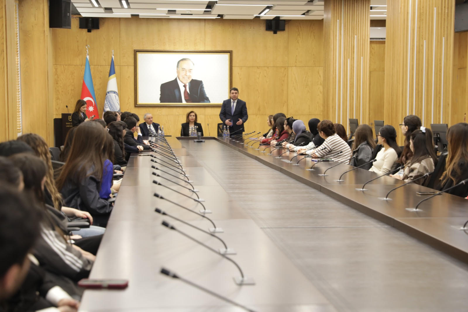 İştirakçıları salamlayaraq çıxış edən BDU-nun Beynəlxalq əlaqələr üzrə prorektoru Şahin Pənahov ilk öncə Yeni Azərbaycan Partiyası İdarə Heyətinin üzvü, Azərbaycan Respublikasının Ailə, Qadın və Uşaq Problemləri üzrə Dövlət Komitəsinin sədri Bahar Muradovanı tələbələrə təqdim edib. Sonra Ümummilli Lider Heydər Əliyev mühazirələrinin əhəmiyyətindən bəhs edən Şahin Pənahov bildirib ki, Bakı Dövlət Universitetidə Yeni Azərbaycan Partiyası Yasamal rayon təşkilatı ilə birgə mütəmadi keçirilən “Ümummilli Lider Heydər Əliyev mühazirələri” gənclərin dövlətçilik təfəkkürünün formalaşmasında mühüm rol oynayır. Bu mühazirələr Ulu Öndərin zəngin siyasi irsinin, azərbaycançılıq ideologiyasının və müasir müstəqil dövlət quruculuğu konsepsiyasının elmi əsaslarla təbliğini təmin edir. Eyni zamanda, YAP Yasamal rayon təşkilatı ilə Bakı Dövlət Universiteti əməkdaşlığı çərçivəsində təşkil olunan bu platforma sağlam və intellektual müzakirə mühitinin inkişafına xidmət edir. Mühazirələr Ulu Öndər Heydər Əliyevin və Onun layiqli siyasi davamçısı Prezident İlham Əliyevin uğurlu fəaliyyətini, ölkəmizin müasir inkişaf strategiyasının siyasi- ideoloji dayaqlarını dərindən anlamağa imkan yaradır. Bu təşəbbüs nəticə etibarilə gənclərin dövlətə bağlı, yüksək bilikli və prinsipial vətəndaş kimi formalaşmasına mühüm töhfə verir.