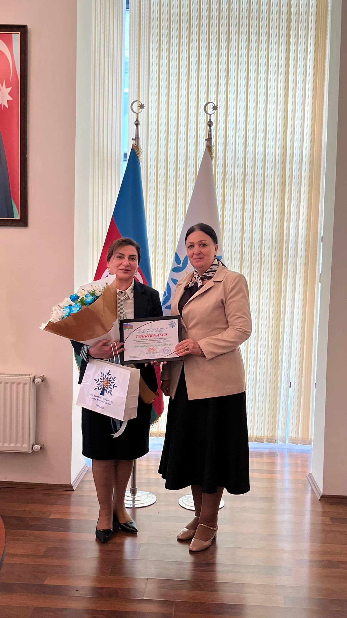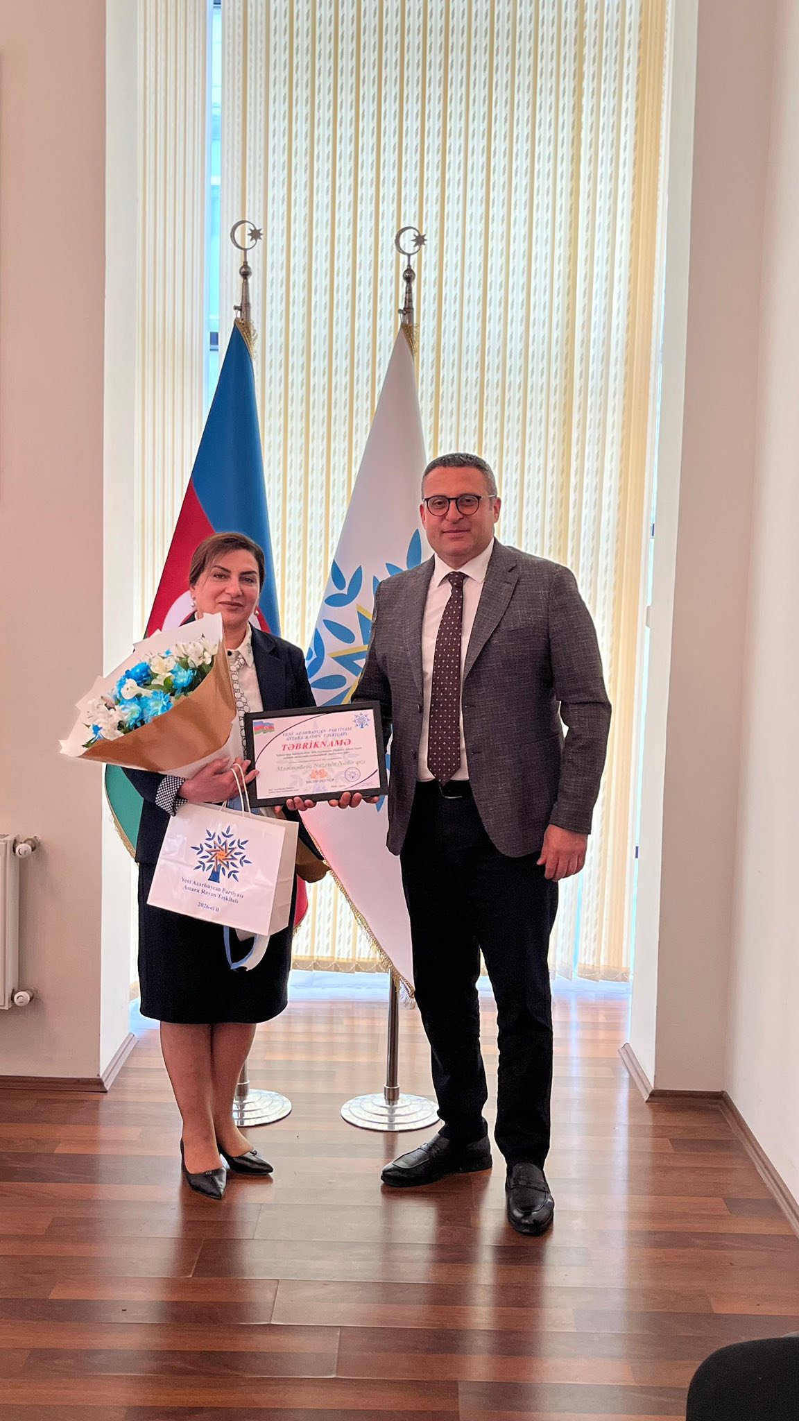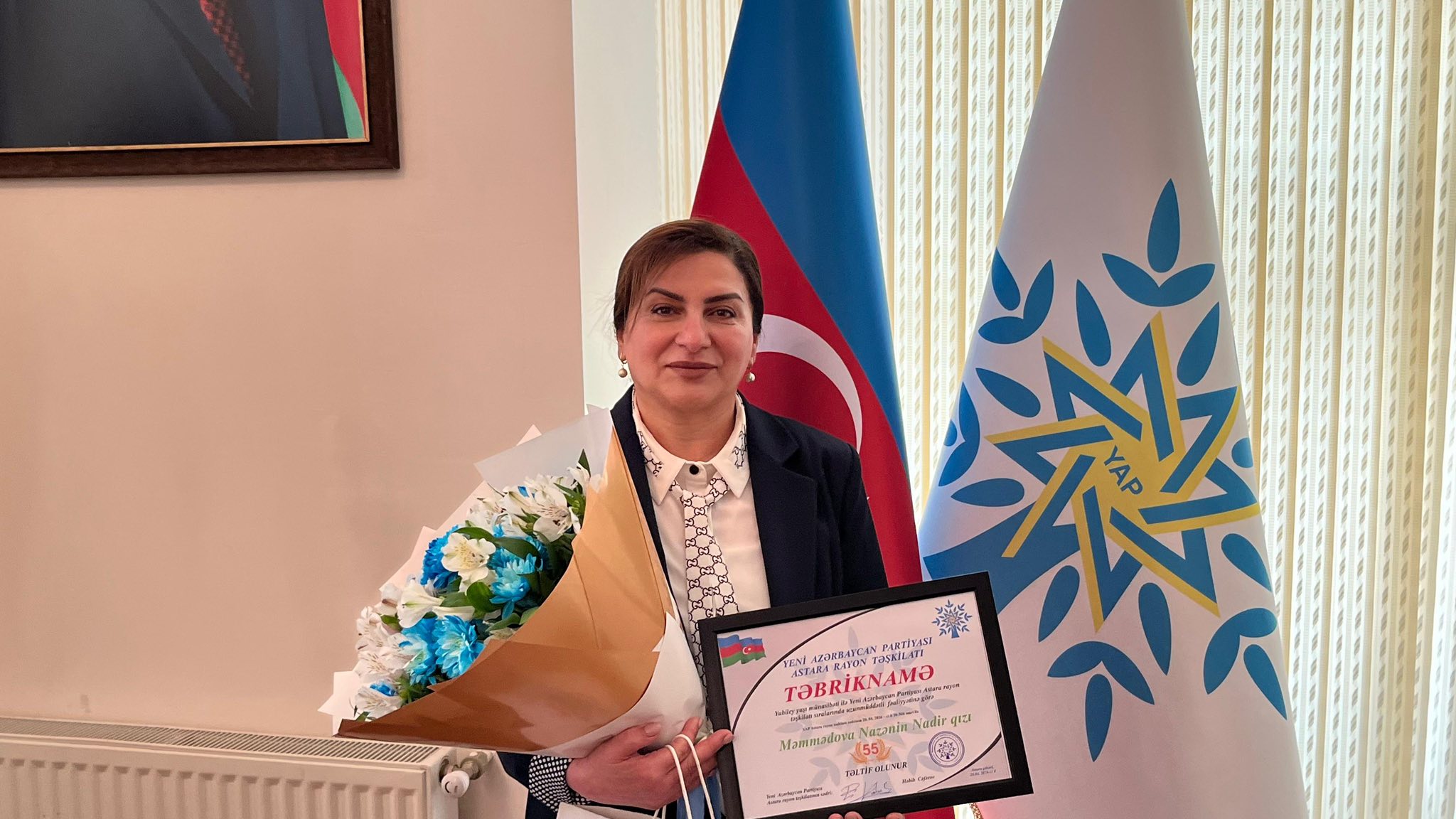 YAP Astara rayon təşkilatında ömrünün 55-ci ilini yola salan Nazənin Məmmədova ilə görüş keçirildi. YAP Astara rayon təşkilatının sədri Həbib Cəfərovun, Lənkəran-Astara Regional Təhsil İdarəsi Astara rayon üzrə Təhsil sektorunun müdiri Xədicə Əliyevanın və YAP rayon təşkilatının əməkdaşlarının qatıldığı görüşdə Nazənin xanımı yubileyi münasibətilə təbrik edib və xoş arzularını ona bildirdilər:-Hörmətli Nazənin xanım, Sizi doğum gününüz münasibətilə Yeni Azərbaycan Partiyası Astara rayon təşkilatı adından səmimi-qəlbdən təbrik edirik. Öz yüksək təşkilatçılıq bacarığınız, fəallığınız və səmimiyyətiniz, partiyaya sədaqətinizlə hər zaman nümunəsiz. Rayonun ictimai-siyasi həyatında göstərdiyiniz fəallıq və üzərinizə düşən vəzifələri məsuliyyətlə yerinə yetirməyiniz xalq tərəfində çox bəyənilir.