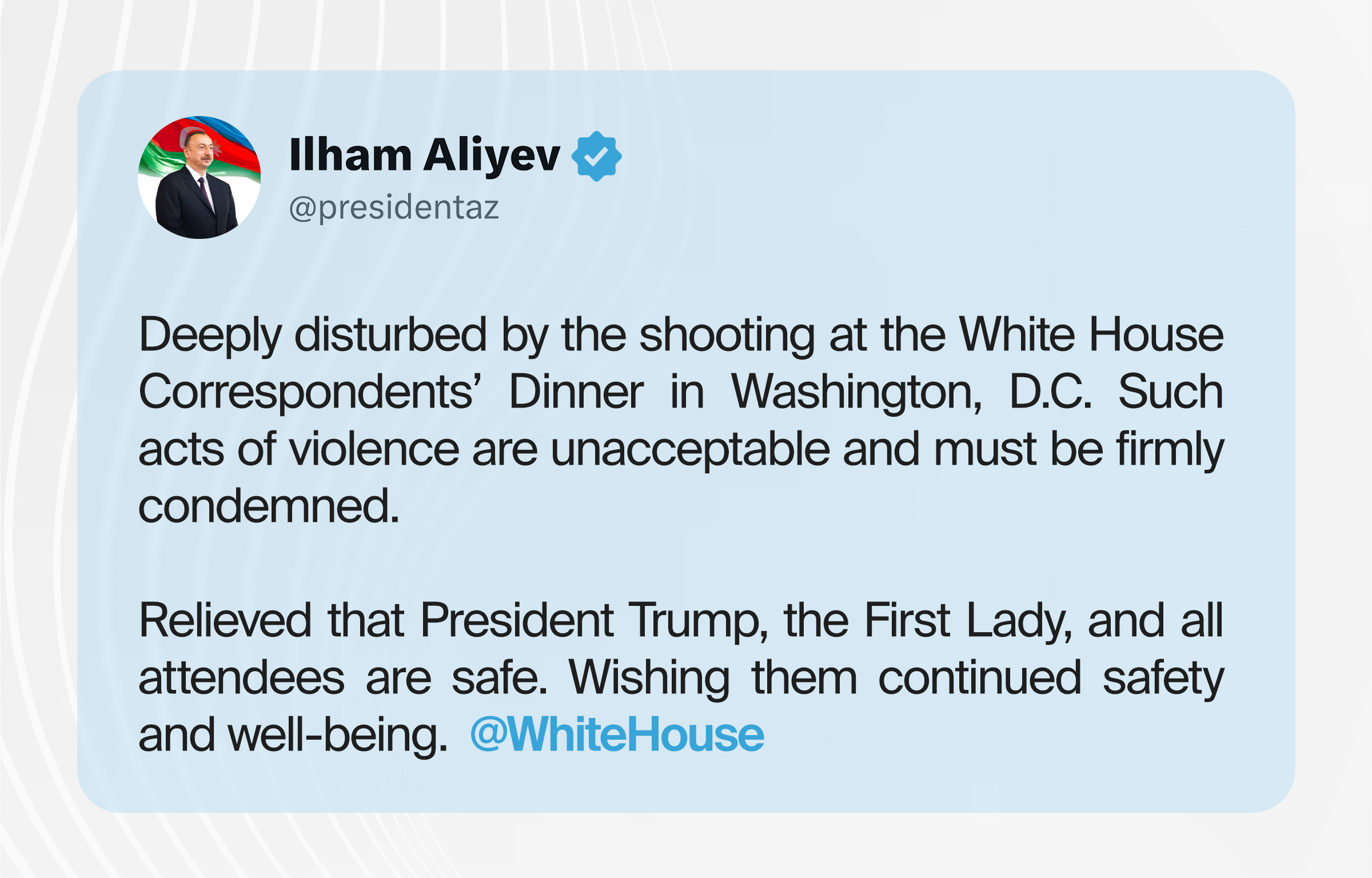 Vaşinqtonda keçirilən Ağ Ev Müxbirləri Assosiasiyasının şam yeməyində baş verən atışma məni dərindən sarsıtdı. SİA rəsmi mənbələrə istinadla xəbər verir ki, bu barədə Azərbaycan Prezidenti İlham Əliyev X sosial media hesabındakı paylaşımında bildirib.