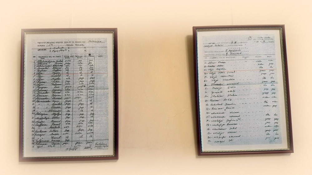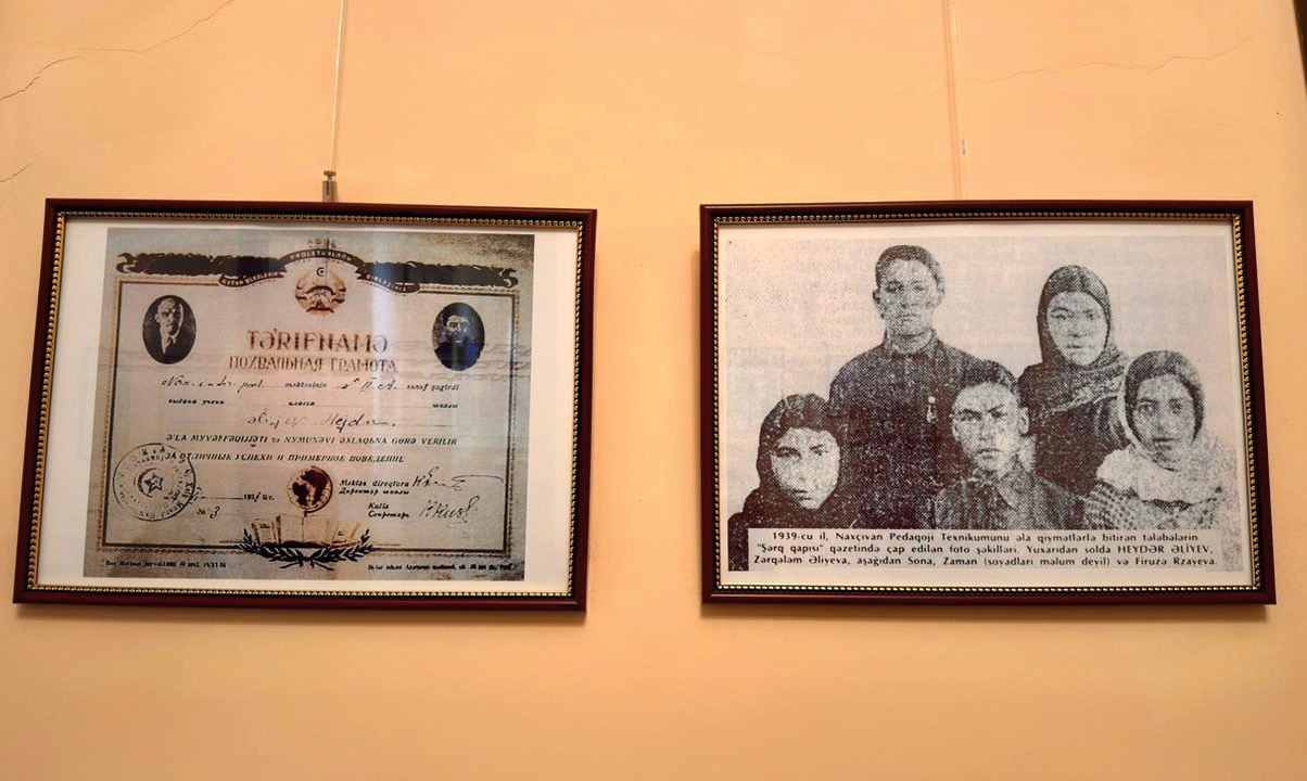 Rəssamlığa marağı olduğunu söyləyən Ulu Öndərin tələbəlik illərində çəkdiyi qızcığaz şəkli muzeyin xatirə otağında sərgilənməkdədir. Şəkilin aşağısında isə “Zərifənin şəkili 12 yaşında çəkilib, 1942-ci il aprelin 27-də axşam saat 0930-da” sözləri qeyd olunub. Xatirə otağının divarından asılan fotoşəkillərə baxdıqca gah üzümüzdə xəfif bir gülümsəmə, gah da ara-sıra o dövrün fotolarının verdiyi təəccüb hissi var idi. Fotoların arasında Ümumilli Liderin Azərbaycan dili və ədəbiyyat müəllimi, ədəbiyyatşünas Lətif Hüseynzadə ilə görüşü zamanı çəkilmiş səmimi kadrlar, təhsil dövründə verilmiş tərifnamələrin nüsxələri də yer alır. Fotoların birində isə 1939-cu ildə Ulu Öndərlə yanaşı, Pedaqoji Məktəbi əla qiymətlərlə bitirən tələbələrin “Şərq qapısı” qəzetində çap edilən fotoşəkilləri, dayısı oğlu Rzaqulu Quluzadə ilə çəkdirdiyi və məzun fotoları yer alır.