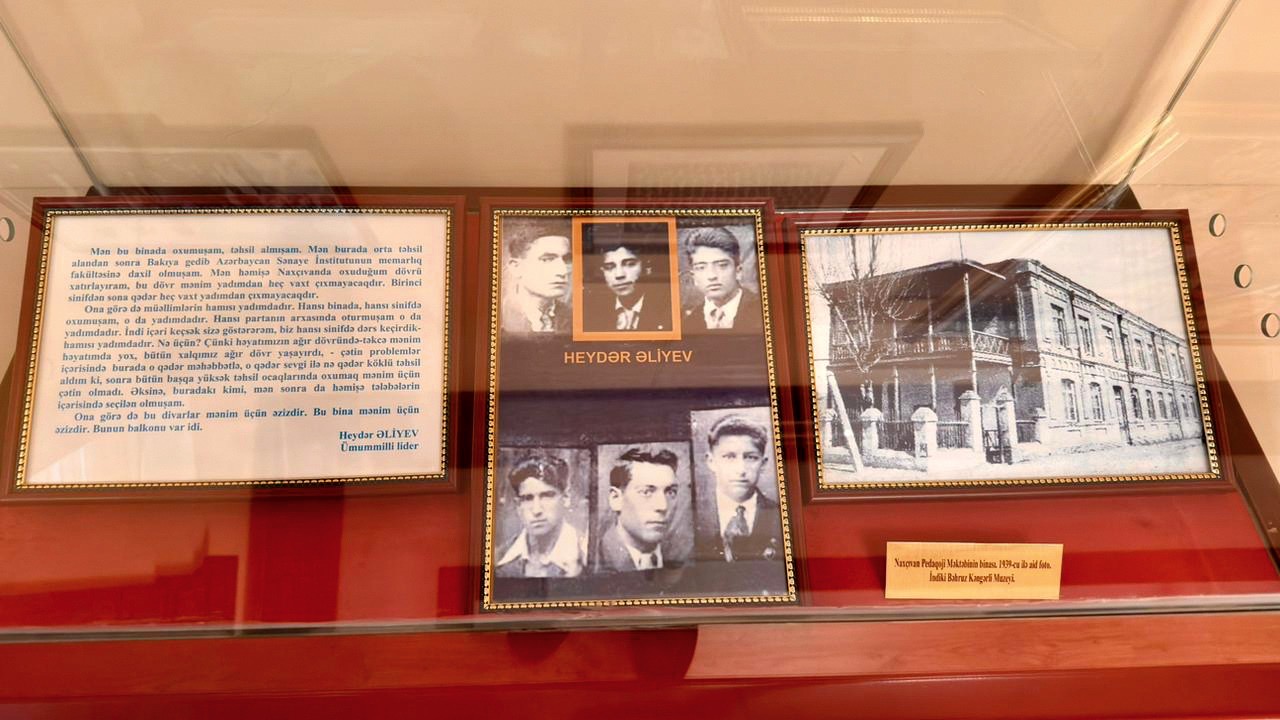 Muzeydə olarkən muzeyin ikinci mərtəbəsində yaradılmış xatirə otağı Ulu Öndər Heydər Əliyevin təhsil aldığı illəri gözlərimizin önündə canlandırır. Bu otaq Onun Naxçıvanda oxuduğu dövrləri, gənclik illərini və o illərin ab-havasını hələ də saxlamaqdadır. Otaqda Ulu Öndərə məxsus fotoşəkillər, təhsil aldığı illərə aid sənədlər və tarixi arxiv materialları sərgilənir. Muzeydə olarkən Ümummilli Liderin Bəhruz Kəngərli barəsində söylədiyi nitq xüsusilə diqqətimizi çəkir: “Yadımdadır, mən həmin bu binada olub orta məktəbdə oxuyarkən Bəhruz Kəngərli haqqında oradanburadan eşidirdik. Amma Bəhruz Kəngərlini üzə çıxaran, təbliğ edən yox idi. Nəyə görə olduğunu bilmirdim, amma onu bilirəm ki, Bəhruz Kəngərli haqqında gənc vaxtımda eşitmişdim. Çünki mən özüm də rəssamlıqla maraqlanırdım. Ona görə də marağım daha çox idi”.
