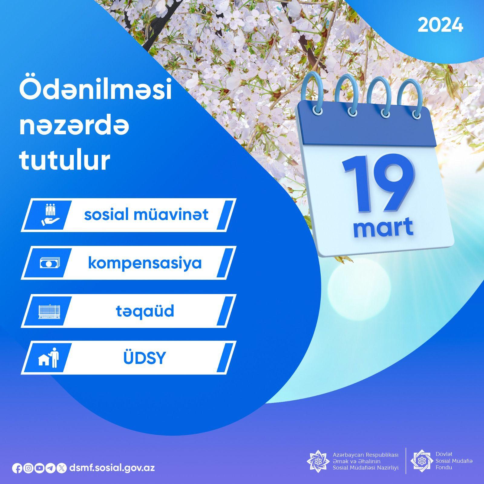 Novruz bayramı ilə əlaqədar martın 19-da bütün müavinət, təqaüd, kompensasiya və ünvanlı dövlət sosial yardımlarının qrafikdən əvvəl ödənilməsi nəzərdə tutulub. Bu barədə SİA-ya Dövlət Sosial Müdafiə Fondundan məlumat verilib.Xatırladaq ki, martın 7-də Bakı və Sumqayıt şəhərləri, Abşeron rayonunda, 15-də isə bölgələrdə yaşayan şəxslərin mart ayı üzrə pensiyaları, habelə güzəştli şərtlərlə təyin edilmiş pensiyalar ödənilib.