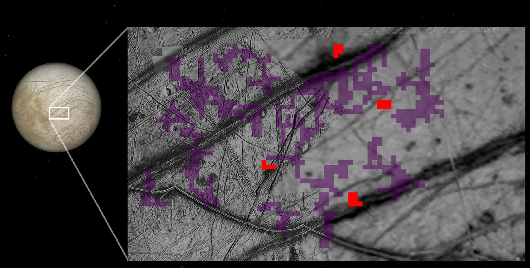 Alimlər Galileo kosmik gəmisindən arxiv məlumatlarını təhlil edərək, Europa-nın buzlu səthində ilk dəfə ammonyak əlamətləri aşkar ediblər.