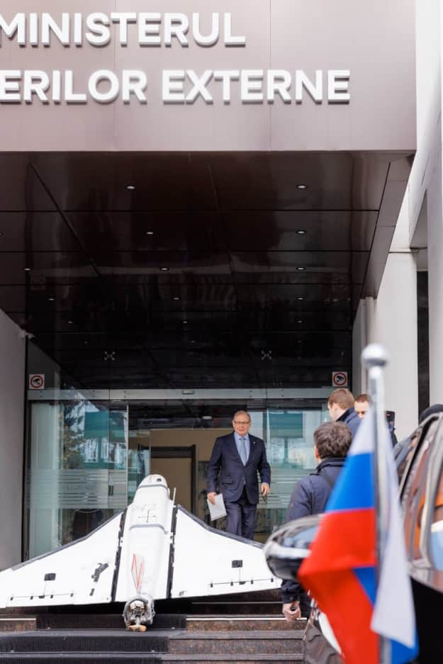 Rusiya səfirinə etiraz notası təqdim etmək üçün onun səfəri zamanı Moldova Xarici İşlər Nazirliyinin binasının qarşısına vurulan pilotsuz təyyarə qoyulub.