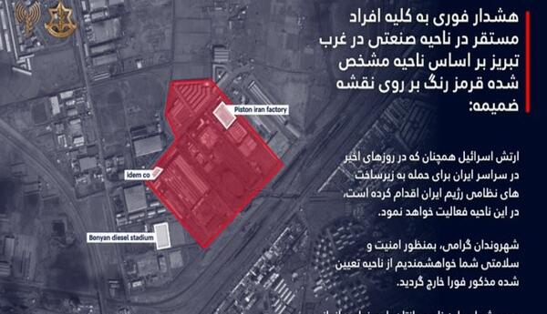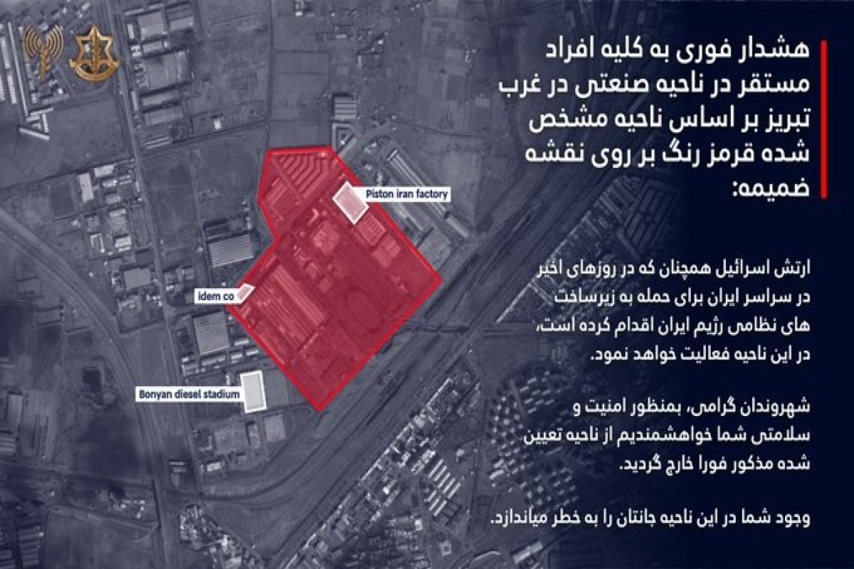 İsrail ordusu Təbriz yaxınlığındakı ərazidə yaşayan sakinlərə planlaşdırılan hava hücumları ilə bağlı təcili xəbərdarlıq edib. SİA xəbər verir ki, bu barədə İsrail Müdafiə Qüvvələri (IDF) məlumat yayıb.